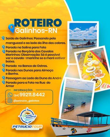 Os principais passeios em Galinhos são ir de charrete até o farol, que é o cartão postal de Galinhos, e ficar na praia do centro, ou ir visitar o vilarejo vizinho, Galos, que você pode ir de barco ou charrete.