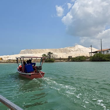 O passeio segue com uma pequena parada na ilha das cobras e no mangue ali próximo para vermos os carangueijos e cavalos marinhos, passamos por um banco de ostras, onde o senhor Petrúcio colheu algumas para serem preparadas no nosso almoço, e seguimos em direção a salina diamante branco