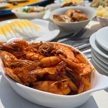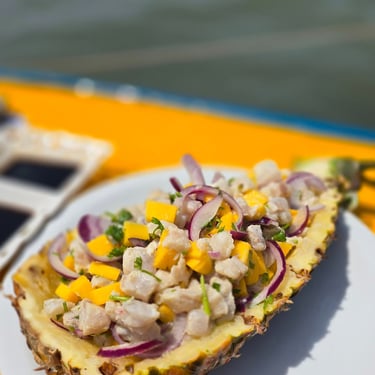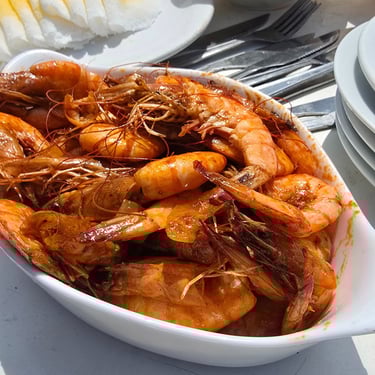 O menu do almoço inclui camarão, ceviche, peixe, ostras, são vários frutos do mar