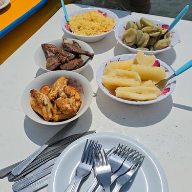E foi numa cozinha totalmente improvisada que o nosso almoço foi preparado, e temos que dar todos os méritos pra esposa do seu Petrúcio, que mesmo no meio da ventania, conseguiu preparar um verdadeiro banquete que eu não daria conta de fazer nem em casa, com toda a estrutura à disposição